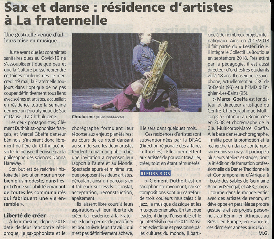 Les deux artistes viennent d’univers très différents : le Nord, le Sud, la danse et la musique se côtoient, se cherchent et se bousculent dans l’objectif ultime de tendre vers l’harmonie. Les jeux électriques de Clément Duthoit aux saxophones et la danse aérienne, théatrale et photographique de Marcel Gbeffa nous emportent dans un monde sans frontière, aux détails anachroniques, traversant les époques et les territoires au fil de mélodies et de rythmes venant de multiples horizons.
