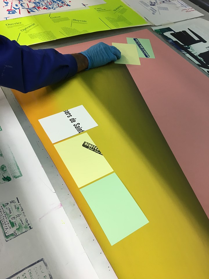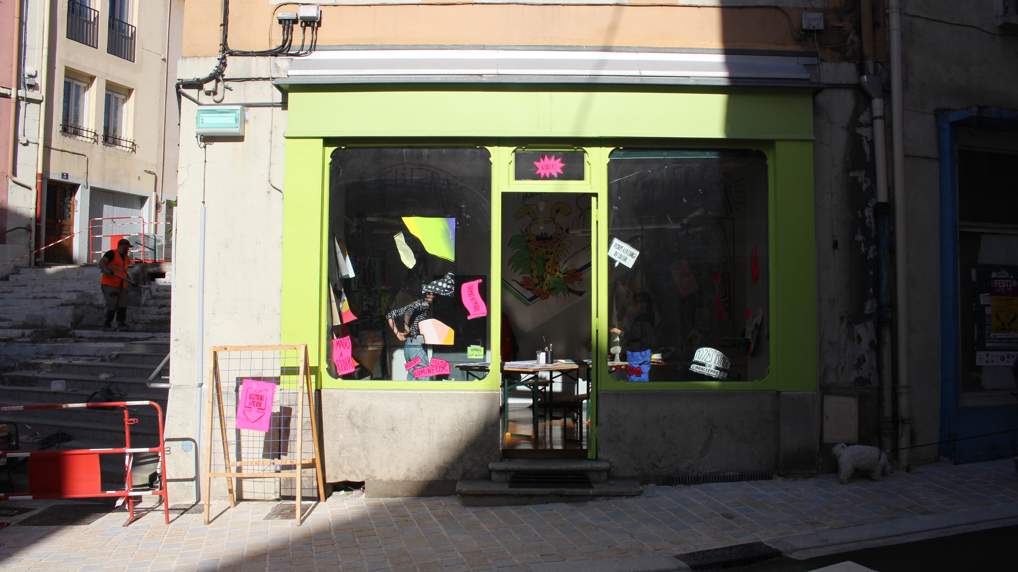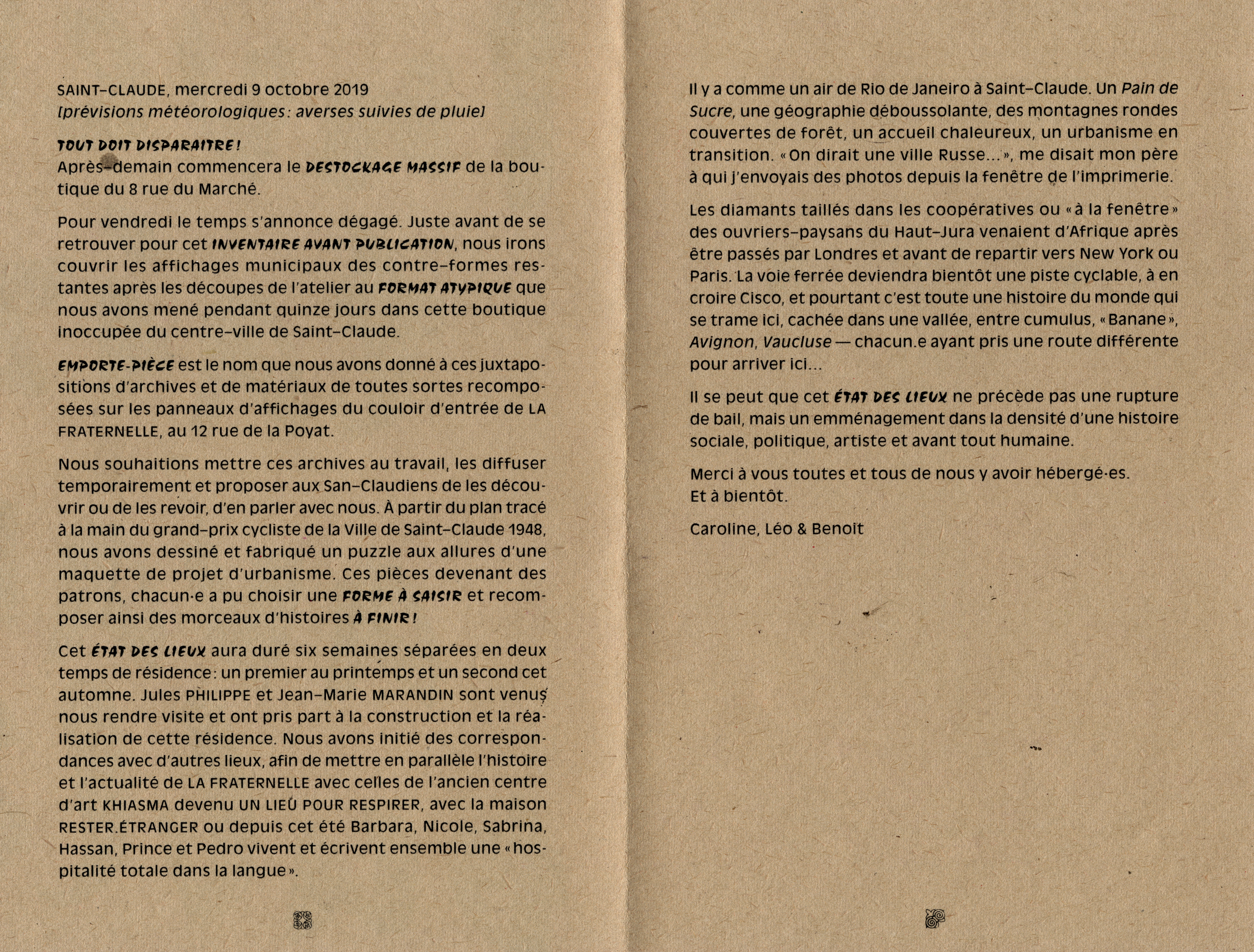 Notre résidence de création à La fraternelle s’inscrit dans une recherche récemment amorcée autour de la notion de Faire lieu. À l’origine de cette recherche se trouvent nos expérimentations collectives sur le format de l’exposition et les différentes façons de l’habiter dès lors qu’on l’envisage comme un milieu vivant et partagé. S’y imbriquent ainsi d’autres pratiques telles que la documentation et l’archive de ce qui a eu lieu dans l’exposition, mais aussi la publication et la diffusion d’éléments imprimés permettant de donner à ces expérimentations une existence textuelle et matérielle.