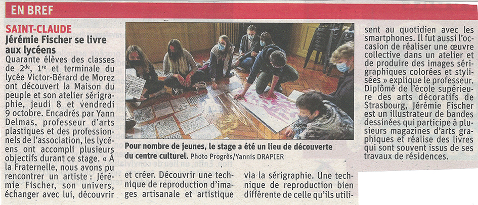 Après plusieurs ateliers menés à Saint-Claude et alentours, il illustre nos programmes cette saison et sera l’invité de nos ateliers pour une carte blanche imprimée. Il interviendra auprès des élèves du lycée Victor Bérard à Morez et des collèges du Plateau à Lavans-lès-Saint-Claude et Pierre Vernotte à Moirans-en-Montagne, pour la réalisation d’affiches en utilisant la technique du papier découpé et du pochoir en sérigraphie.