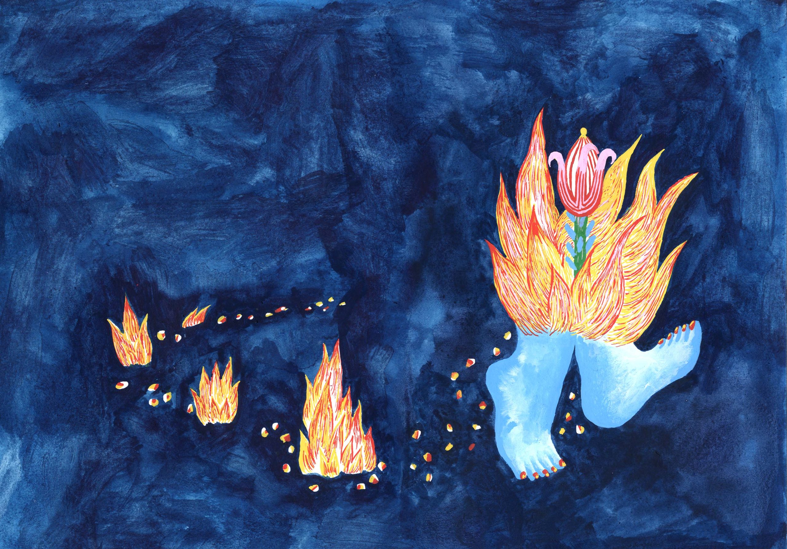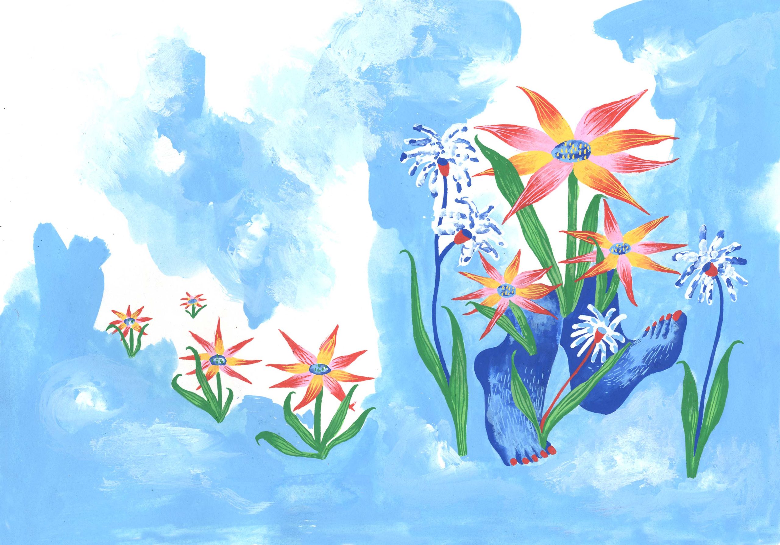 Elle puise également dans les éléments de la culture populaire pour composer et faire ses propres récits, lisibles ou non pour la regardeuse et le regardeur. C’est aussi, en termes de culture visuelle, une des raisons de son attachement à l’utilisation de couleurs psychédéliques. C’est en ayant recours à cet imaginaire qui a cherché à mettre en avant les phénomènes psychiques conscients et inconscients par l’usage de la couleur notamment, qu’elle essaye d’effleurer ces aspects de nos vies, de nos affects, de notre existence.