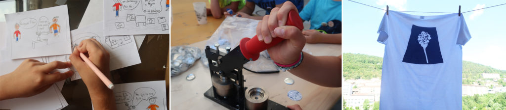 À travers la fabrication d’objets utiles au quotidien : sacs, t-shirts, carnets… Les jeunes seront amenés à appréhender différentes techniques artisanales : sérigraphie textile, fabrication de tampons, typographie, fabrication de papier, couture.