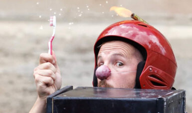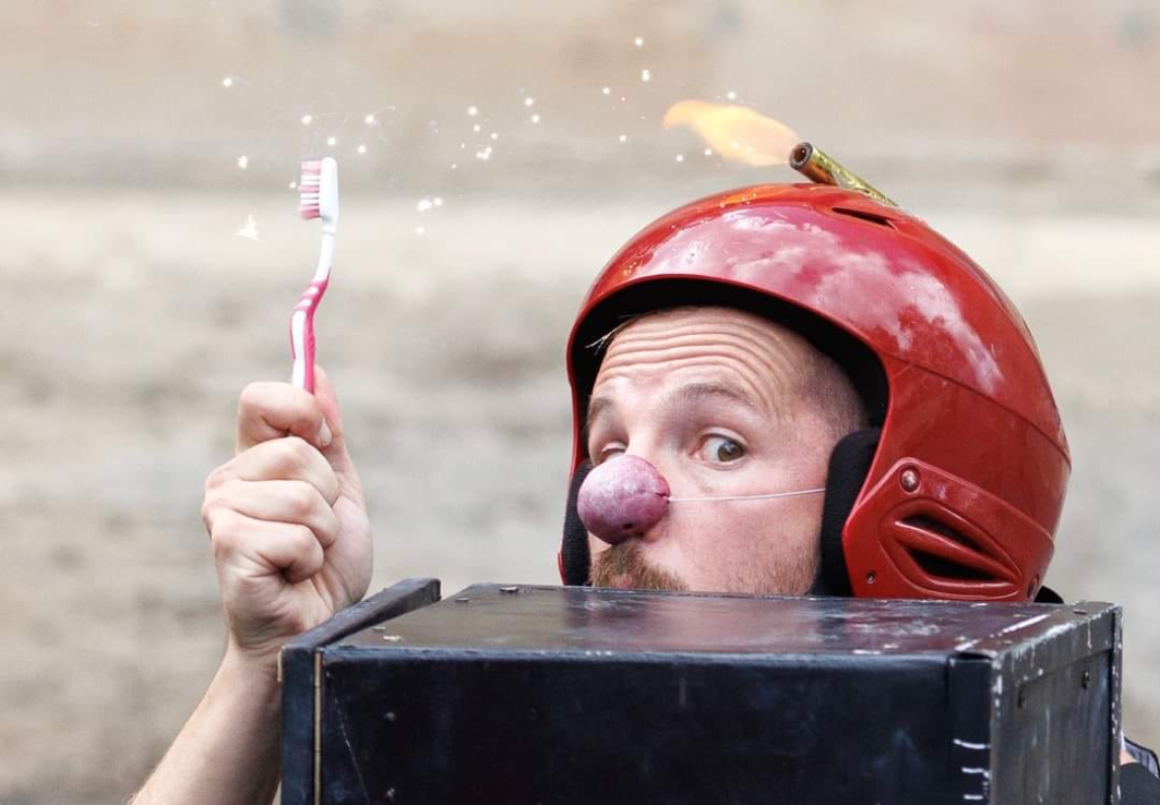 Un tube de dentifrice à la main, un clown se fraye un chemin.