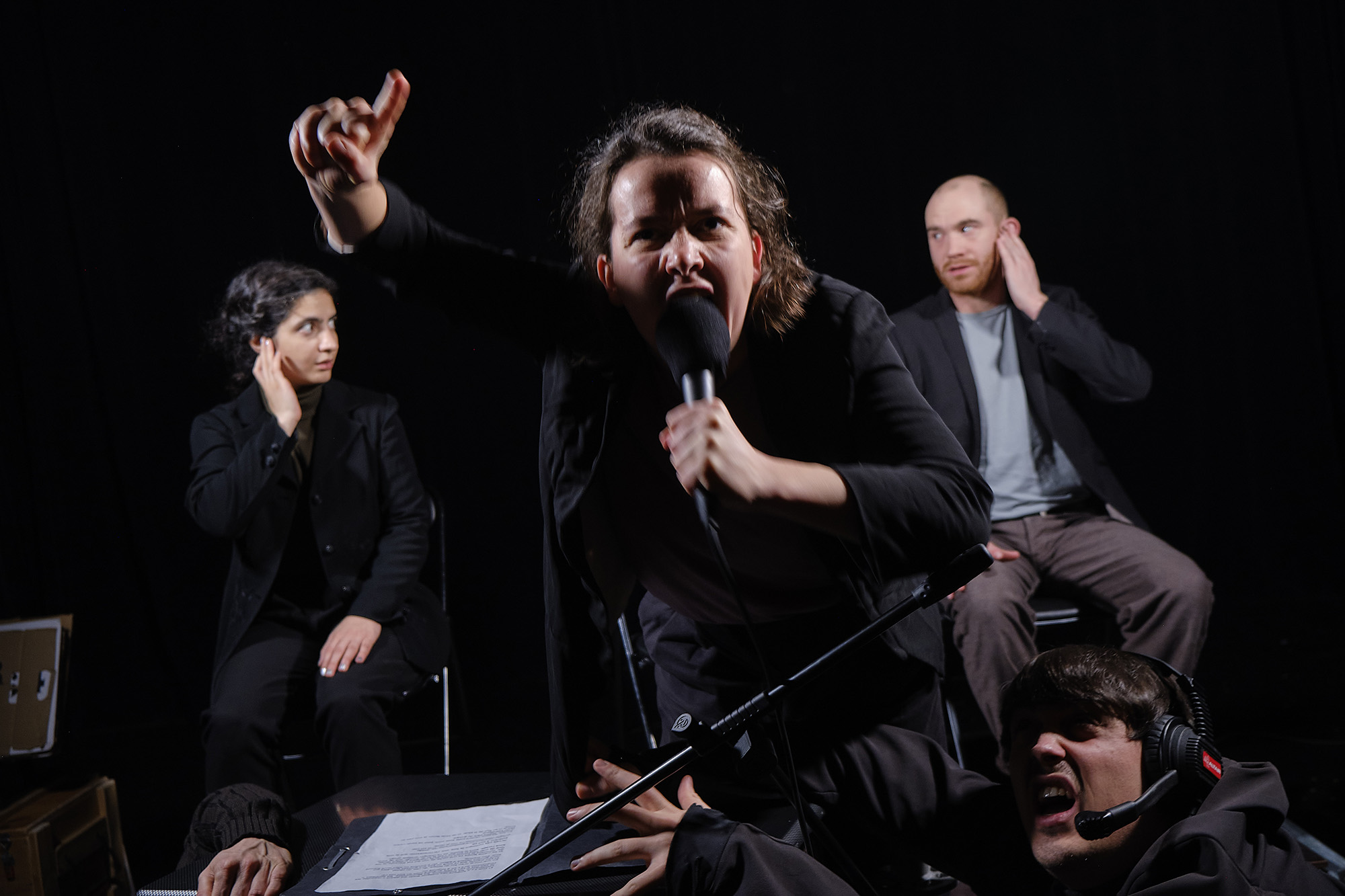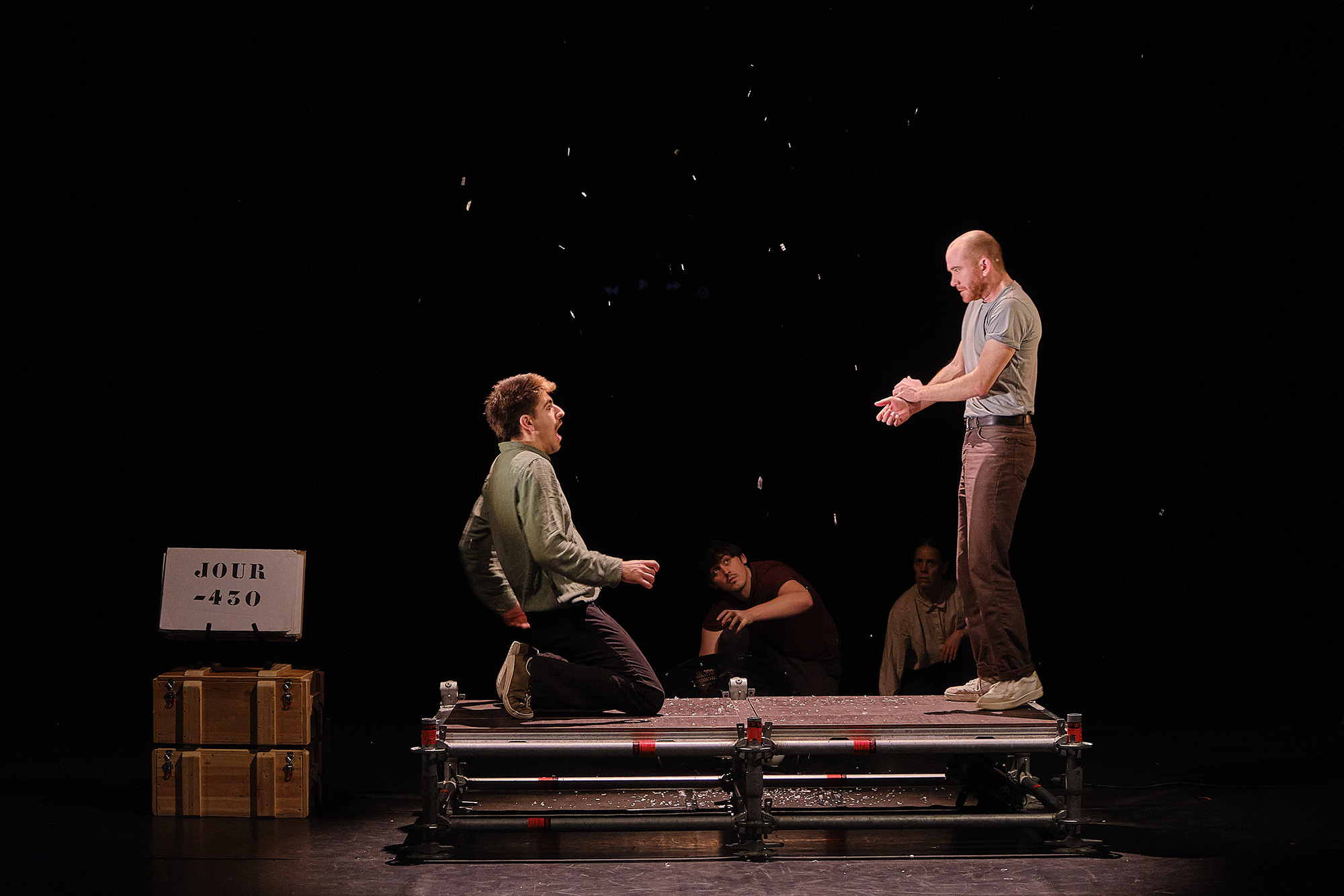 Sept comédien.ne.s de cinq nationalités différentes, qui créent sur deux mètres carrés, espaces, décors, personnages, rêves et tempêtes.