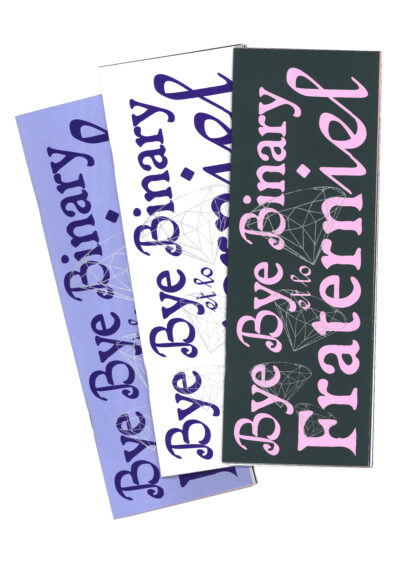Bye Bye Binary, est une collective franco-Belge qui explore de nouvelles formes graphiques et typographiques adaptées à la langue française, notamment la création de glyphes (lettres, ligatures, points médians, éléments de liaison ou de symbiose) prenant pour point de départ, terrain d’expérimentation et sujet de recherche le langage et l’écriture inclusive et non-binaire.