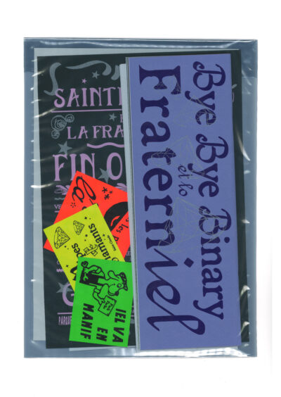 Bye Bye Binary, est une collective franco-Belge qui explore de nouvelles formes graphiques et typographiques adaptées à la langue française, notamment la création de glyphes (lettres, ligatures, points médians, éléments de liaison ou de symbiose) prenant pour point de départ, terrain d’expérimentation et sujet de recherche le langage et l’écriture inclusive et non-binaire.