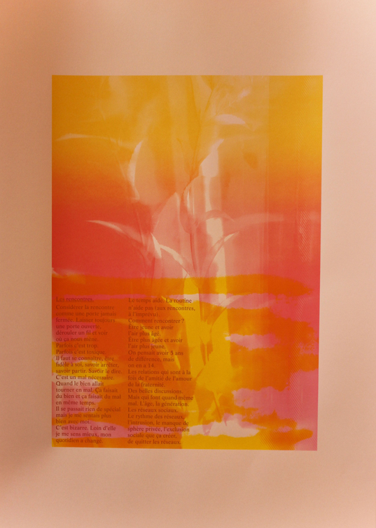 Designer graphique et artiste culinaire, Céline Pelcé et Sophie Decoux ont engagé une dialogue sur la question du support graphique relatant du sensoriel et de l’éphémère : de ce qui n’est plus, mais ce qui a été perçu. Cette question est double : c’est à la fois une exploration humaine de nos rapports culturels à la cuisine, mais aussi à la recherche d’une forme de retranscription qui serait aussi sensible que l’expérience qu’elle relate.