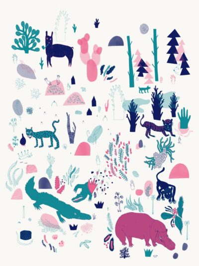 Cette sérigraphie réalisée lors d’un stage à La fraternelle en août et septembre 2016, reprend les éléments fidèles à l’univers graphique d’Adèle sous l’image onirique d’une jungle imaginaire. À vous de trouver le petit chien !