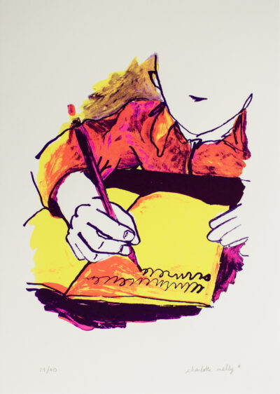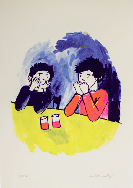 Série de 30 estampes, ces images composent une histoire… Sortir du ventre du loup raconte le traumatisme de petit chaperon rouge une fois sorti du ventre du loup.