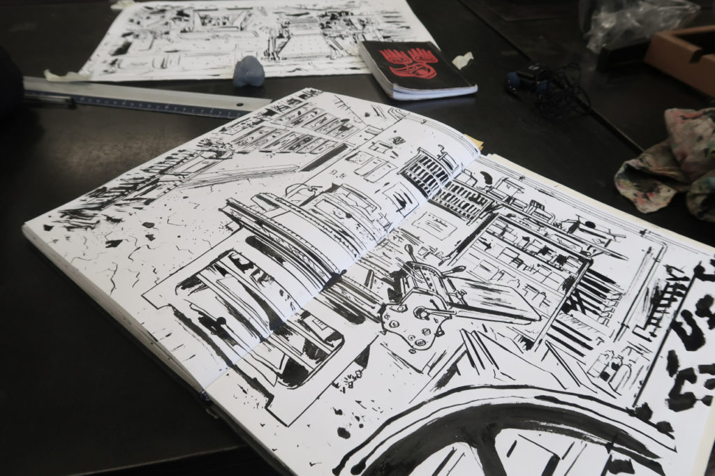 Work in progress du projet de Renaud Thomas, auteur de bande dessinée, qui nous a rendu visite pour réaliser une série de vues de l’imprimerie et de ses machines. À suivre…